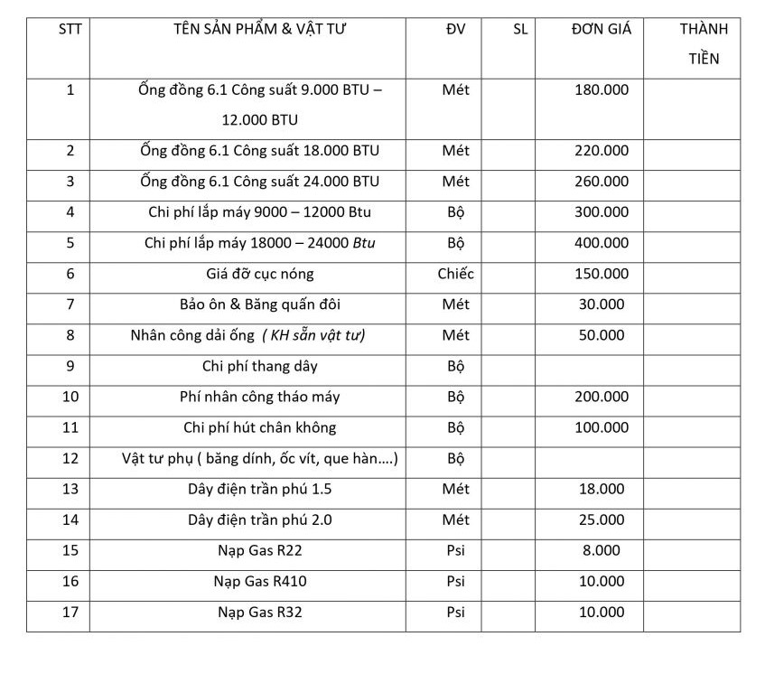 BẢNG BÁO GIÁ THÁO LẮP ĐIỀU HÒA TẠI HƯNG YÊN